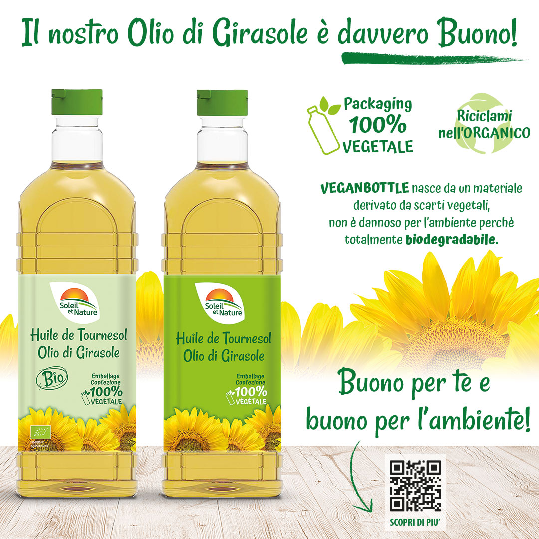 Il nuovo olio di girasole ha un packaging 100% vegetale e compostabile. La prima bottiglia realizzata con un materiale derivato da scarti organici, un’alternativa alla plastica tradizionale in PET.
